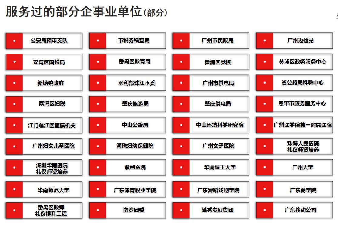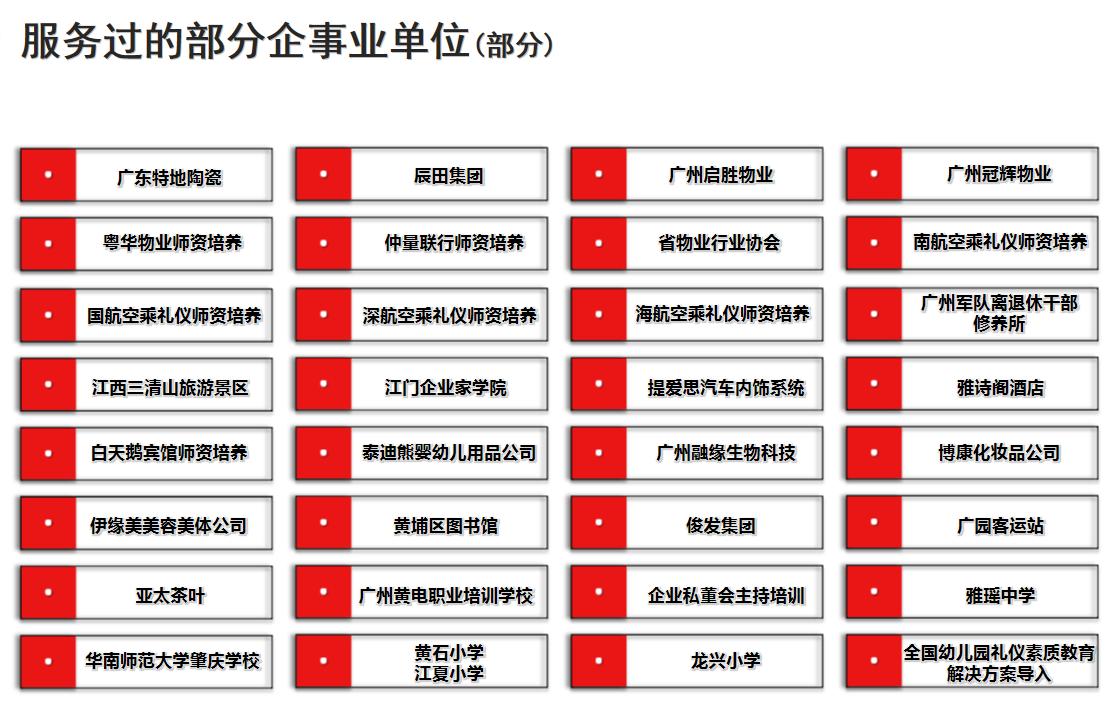 主講課程:《商務禮儀》《政務禮儀》《服務禮儀》《社交禮儀》《職業溝通》《銷售禮儀》《職業形象塑造》《崗位規範SOP標準流程管理》等禮儀課程。