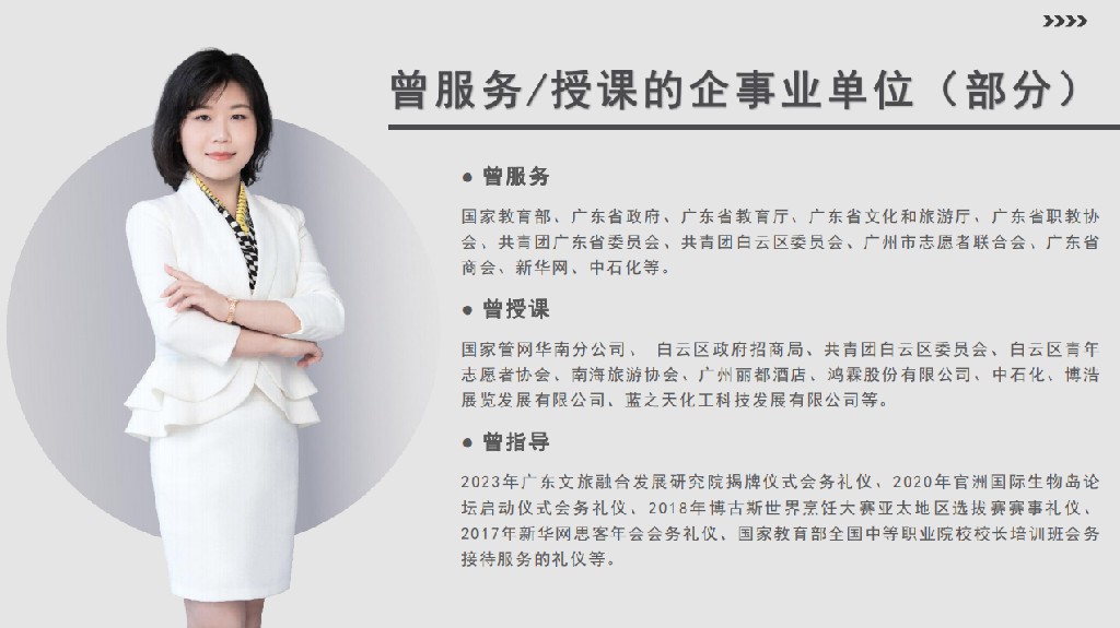 主講課程:《服務禮儀》《接待禮儀》《商務禮儀》《職場禮儀》《誌願服務禮儀》《青少年禮儀》等。