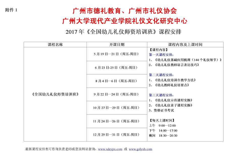2017年《全國幼兒禮儀師資培訓班》課程安排時間