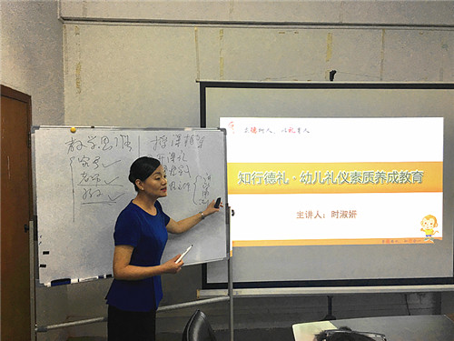 第二天上午時段,時淑妍老師為大家講授了《幼兒禮儀構建家園共育、特色園、師德建設的方法》。下午時段,時淑妍老師則從如何為幼兒園及學前教育機構提供禮儀課程,和幼兒禮儀效果呈現方式兩部分講解了《幼兒禮儀培訓師可複製的課程體係導入方法》。