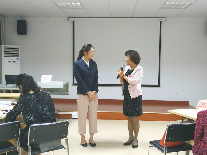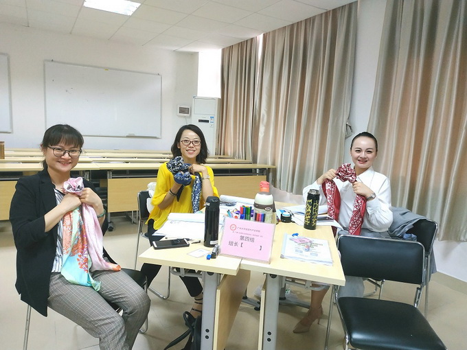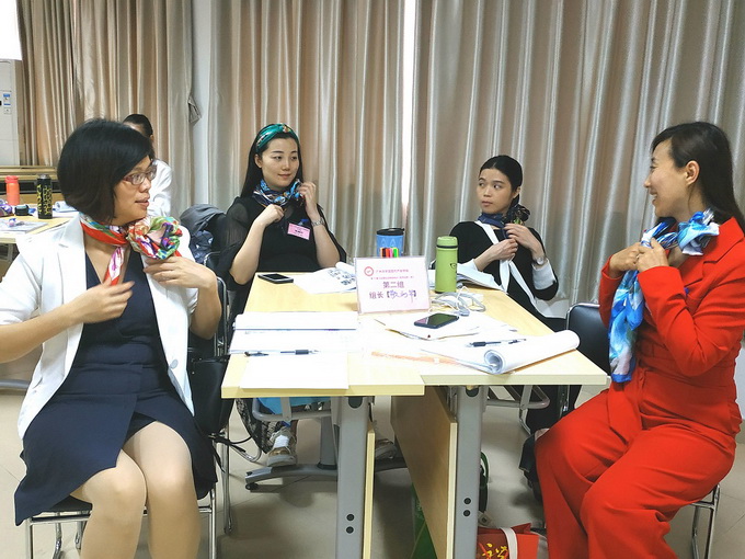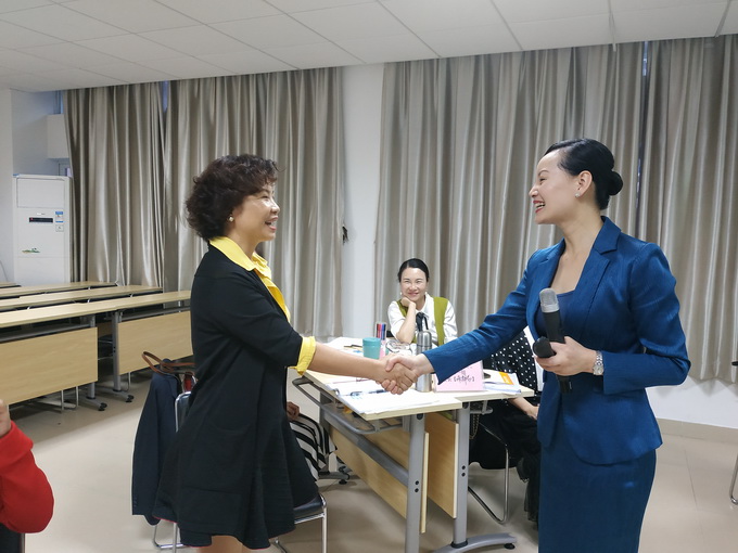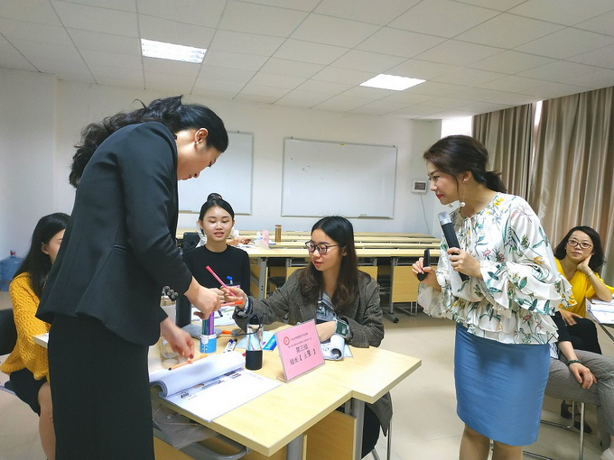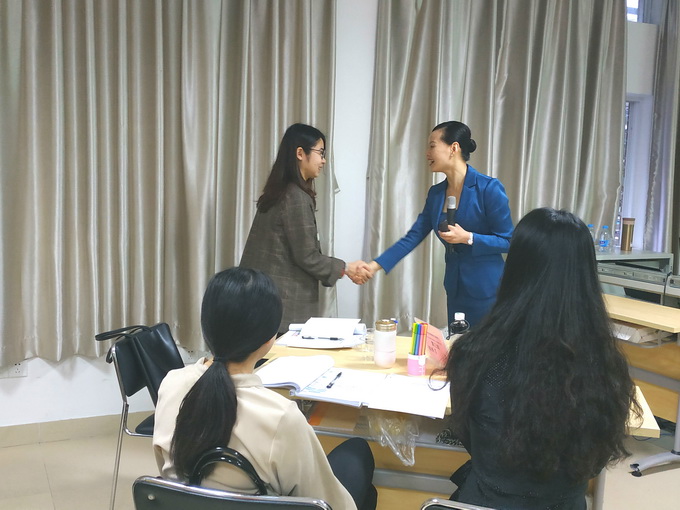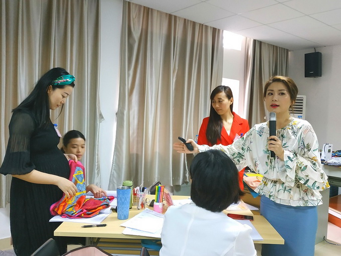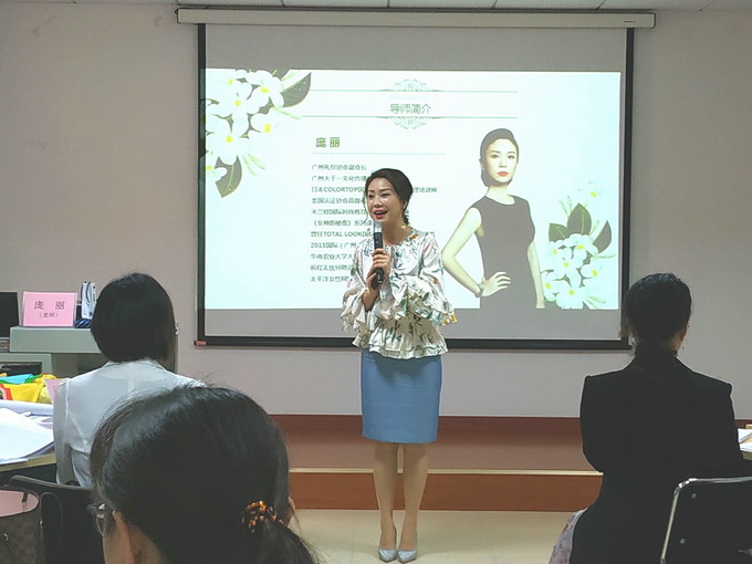 龐麗老師為大家講解了形象塑造中的皮膚色彩、服裝色彩等搭配方麵的理論知識,並教授學員如何運用穿衣技巧改善身形、打造職業禮儀培訓師的專業形象。