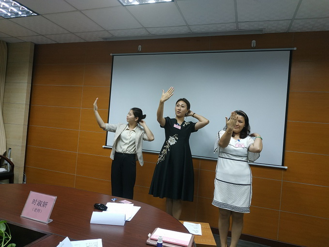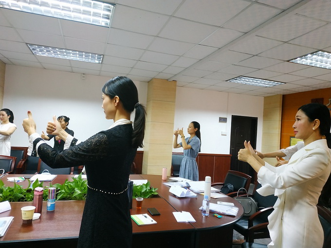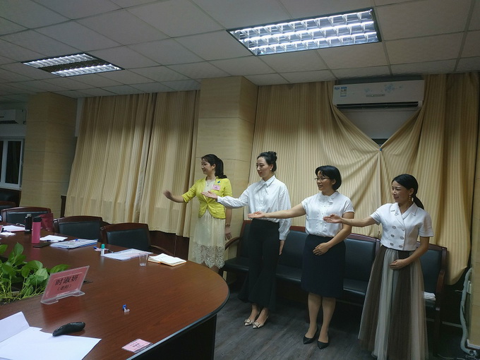 晚間學習時間段,由時淑妍老師講授《禮儀操編排教學》課程。在禮儀操編排教學課程開始前,時淑妍老師再次從禮儀行為規範:站姿、坐姿、走姿、蹲姿、指引、握手、遞接物品、等禮儀細節進行係統的梳理和指導。作為一名禮儀培訓師,首先要把自己禮儀行為規範標準化、細節化,並形成日常的生活習慣,才能在今後開展培訓工作中,做到標杆作用!