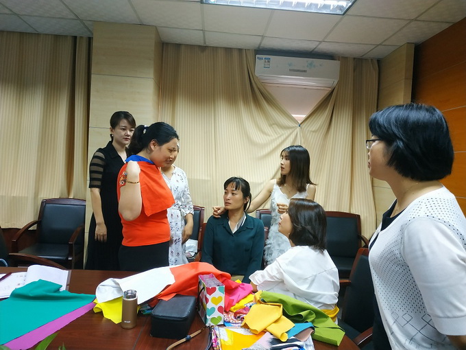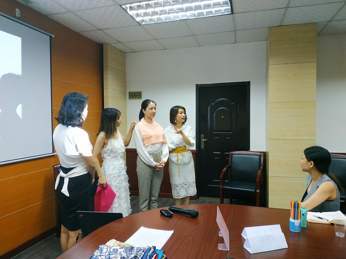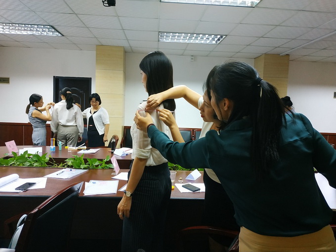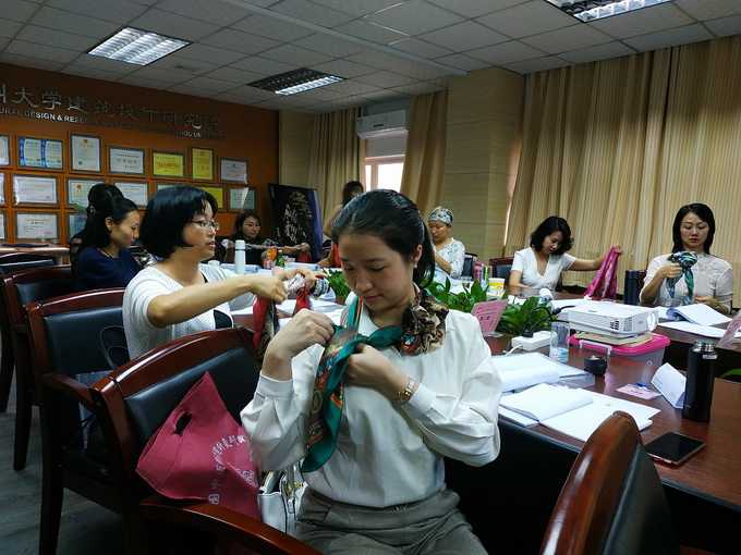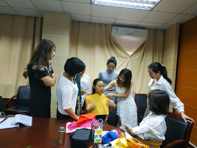 龐麗老師為大家講解了形象塑造中的皮膚色彩、服裝色彩等搭配方麵的理論知識,並教授學員如何運用穿衣技巧改善身形、打造職業禮儀培訓師的專業形象。