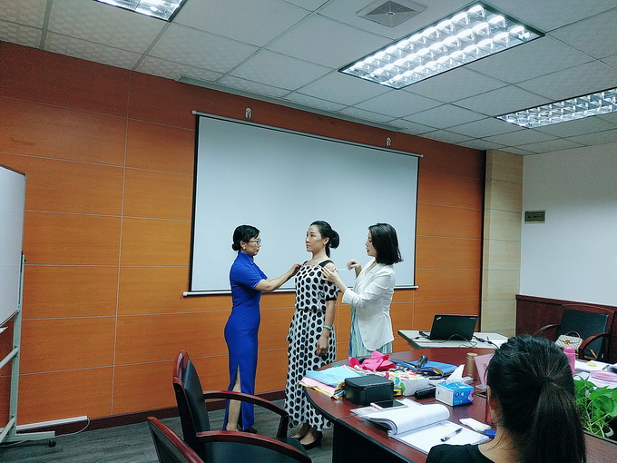 龐麗老師為大家講解了形象塑造中的皮膚色彩、服裝色彩等搭配方麵的理論知識,並教授學員如何運用穿衣技巧改善身形、打造職業禮儀培訓師的專業形象。