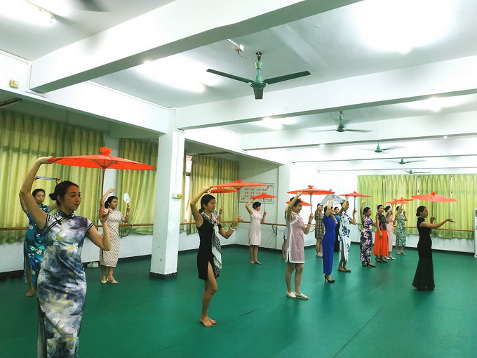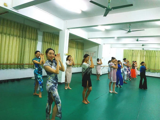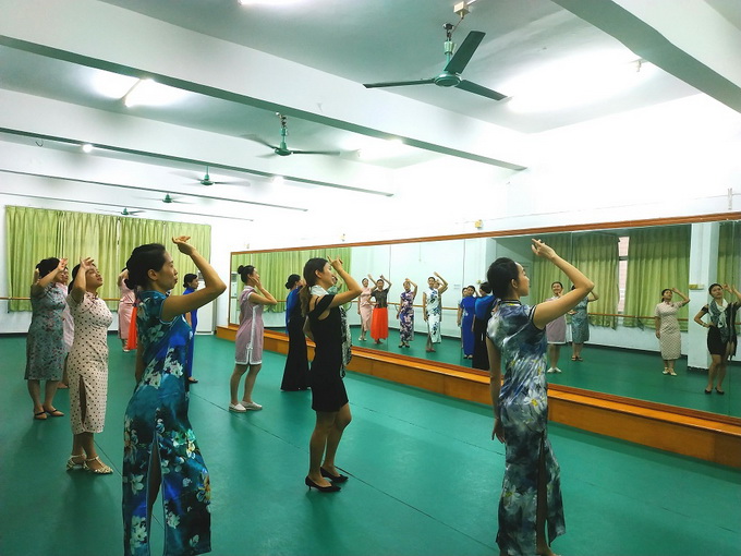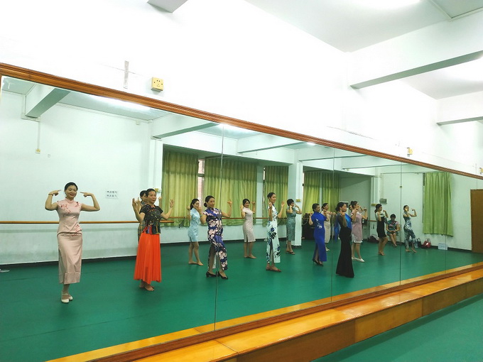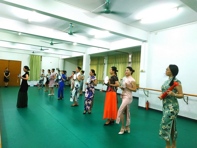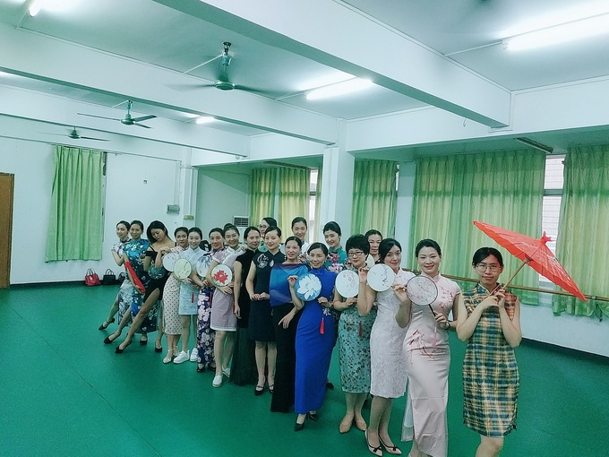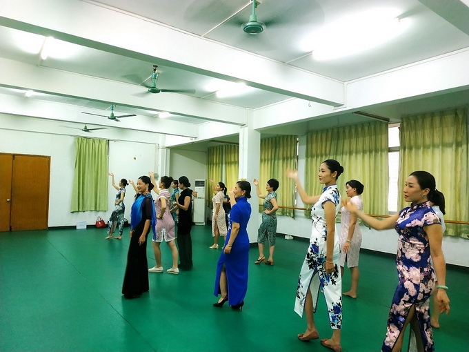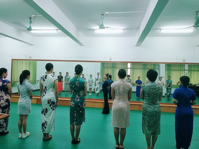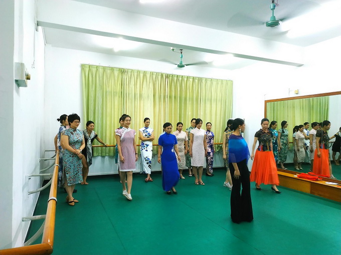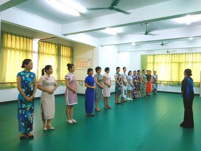 師shi資zi班ban學xue員yuan們men身shen著zhe優you雅ya的de旗qi袍pao,齊qi聚ju在zai練lian習xi室shi。劉liu燕yan玲ling老lao師shi向xiang學xue員yuan們men詮quan釋shi了le中zhong國guo旗qi袍pao所suo展zhan現xian的de東dong方fang女nv性xing的de婉wan約yue之zhi美mei,學xue員yuan們men在zai進jin行xing優you雅ya儀yi態tai訓xun練lian的de同tong時shi,也ye深shen刻ke感gan受shou到dao旗qi袍pao禮li儀yi所suo蘊yun含han的de深shen厚hou文wen化hua。