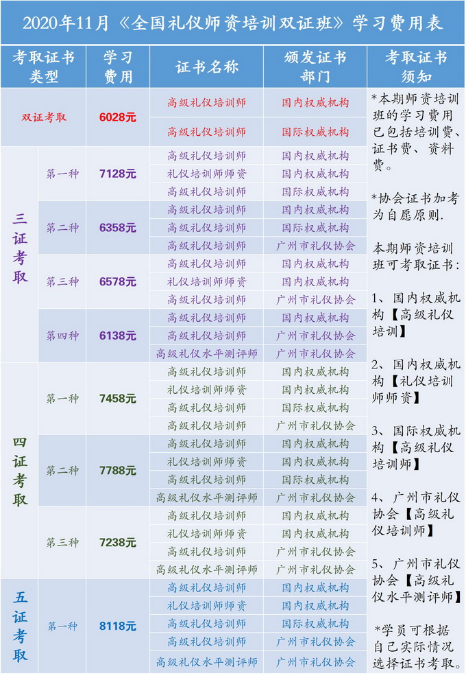 (1)雙證書考取:國內權威機構認證的 【高級禮儀培訓師證書】和國際權威機構認證的【高級禮儀培訓師證書】,學習費用:6028元/人(可刷公務卡繳費,可開具增值稅專用發票)。