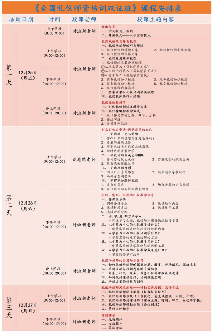 為了提高全民素質、促進社會的文明進步、推廣普及禮儀文化;peiyangyouxiudeliyijiaoyupeixungongzuozhe,guifanjiaoxueneironghejiaoxuefangfa,zengqiangshoukenengli,tigaoliyishizishuipingheshoukezhiliang,jianliliyijiaoxuepeixunzhuanyejiaoshiduiwu,guangzhoushidelijiaoyu、廣州市禮儀協會將於2020年12月25日至27日在廣州舉辦《全國禮儀師資培訓雙證班》。詳情如下: