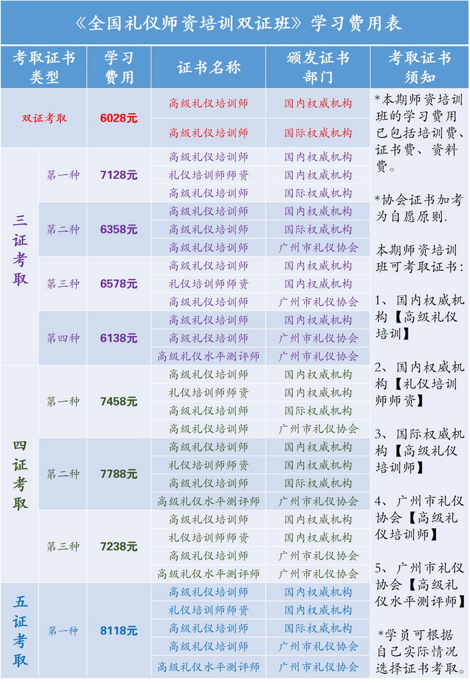 (1)雙證書考取:國內權威機構認證的 【高級禮儀培訓師證書】和國際權威機構認證的【高級禮儀培訓師證書】,學習費用:6028元/人(可刷公務卡繳費,可開具增值稅專用發票)。