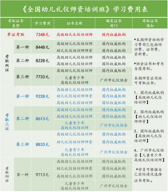 (1)單證書考取:權威機構認證的【高級幼兒禮儀培訓師證書】,學習費用為7348元/人。