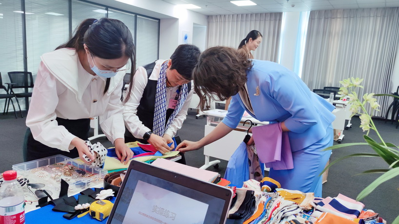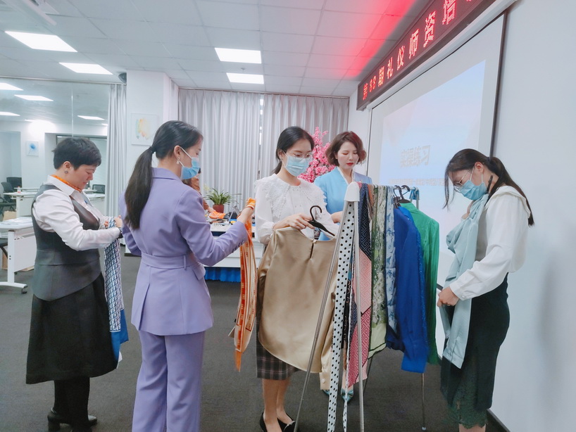龐老師為大家講解了服裝色彩搭配等方麵的理論知識,並教授學員如何根據自己的膚色來選擇適合自己的服裝。